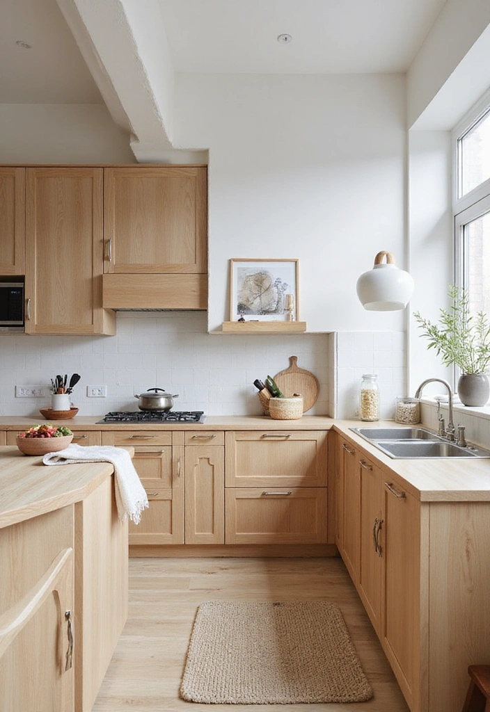 – Incorporate light wood or whitewashed cabinetry for an airy feel.