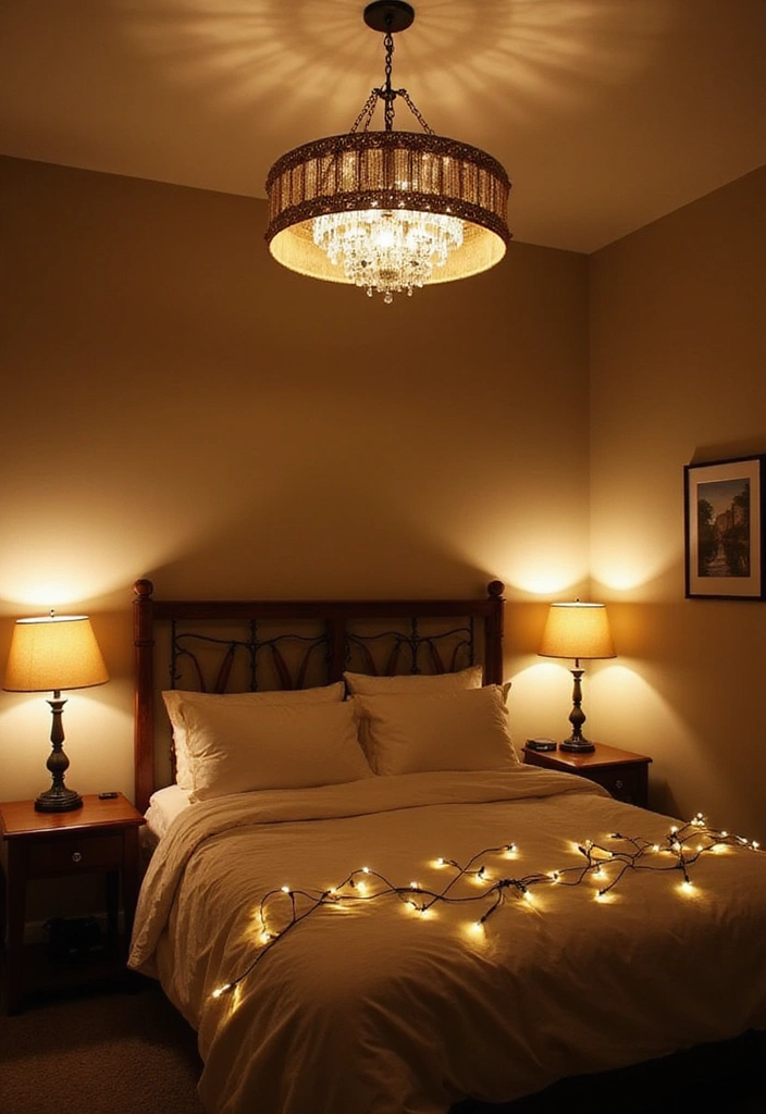 For instance, use a ceiling fixture for general light, bedside lamps for reading, and candles or string lights for warmth.