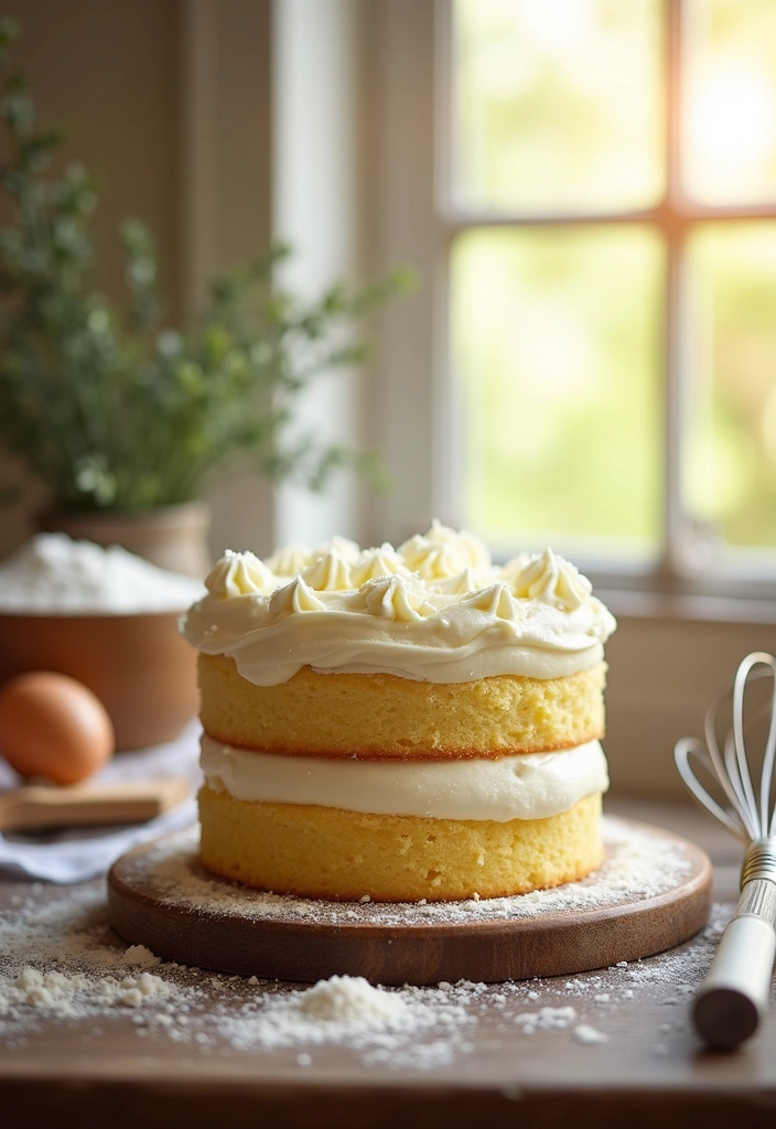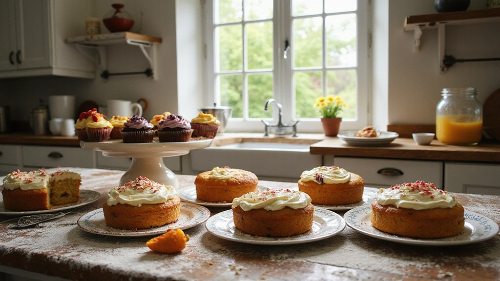 Imagine a bright, inviting kitchen filled with delectable baked goods. Beautifully frosted cakes stand proudly on a rustic wooden table, while colorful cupcakes peek out from a vintage cake stand. A sunny window lets in just the right amount of light, illuminating a spread of baking tools and ingredients, with flour dust lightly covering the surface. In the background, a splash of fresh fruits adds color and freshness to the scene.