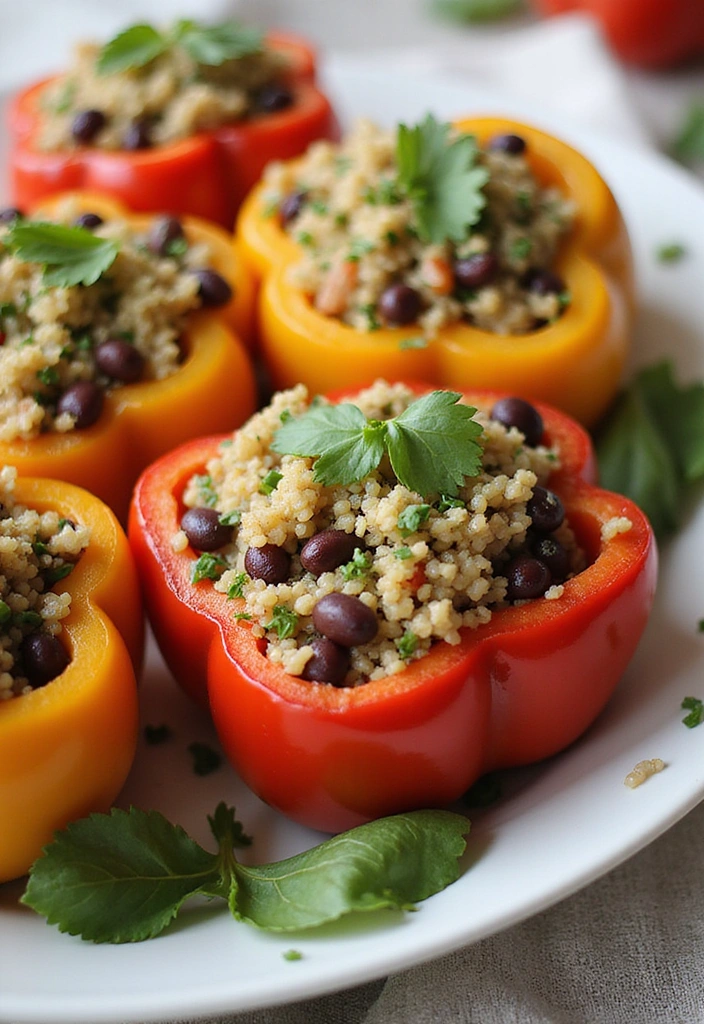 These quinoa and black bean stuffed peppers are the perfect balance of flavor and nutrition. Roasted bell peppers are filled with a savory mixture of quinoa, black beans, corn, and spices, then baked until everything is heated through. This dish is not just colorful; it’s also full of protein and fiber, making it a complete meal on its own.