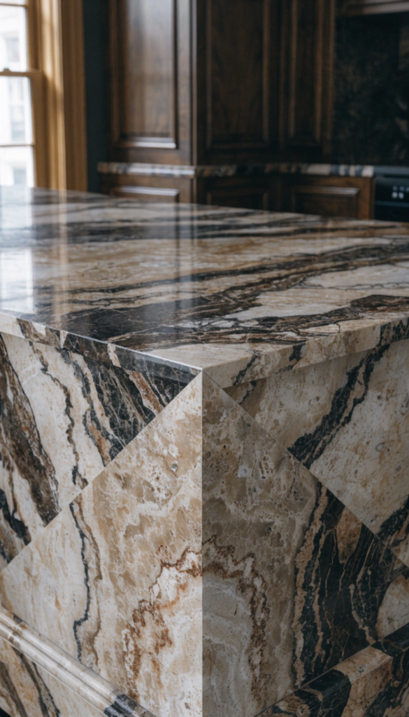 • The Vibe: This stone is for the homeowner who isn’t afraid of color. It pairs beautifully with “Old Money” brass hardware and navy or forest green cabinetry. For more on coordinating these high-end finishes, check out The Ultimate Guide To professional material pairing.