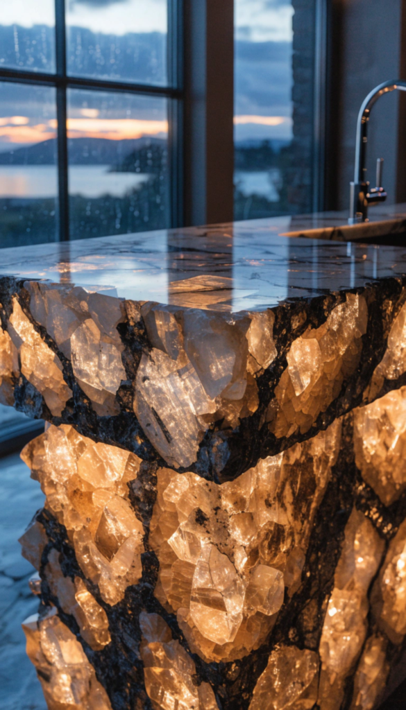 • The Designer’s Secret: This stone’s superpower is its translucency. When paired with custom LED backlighting, the “crystal zones” of the island glow, transforming the kitchen into a high-end lounge after sunset.