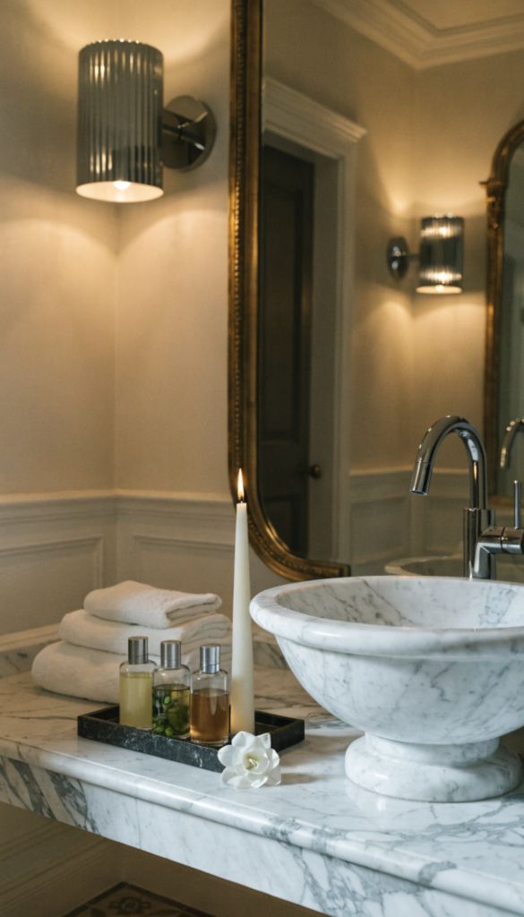 Beyond towels, a small tray on the bathroom counter corrals your products and makes everything look intentional rather than scattered. Decanting your everyday products into simple matching bottles removes visual clutter and creates that clean, curated look that hotel bathrooms maintain effortlessly. Add a small candle or a single stem in a bud vase, and the room transforms from functional to genuinely beautiful.