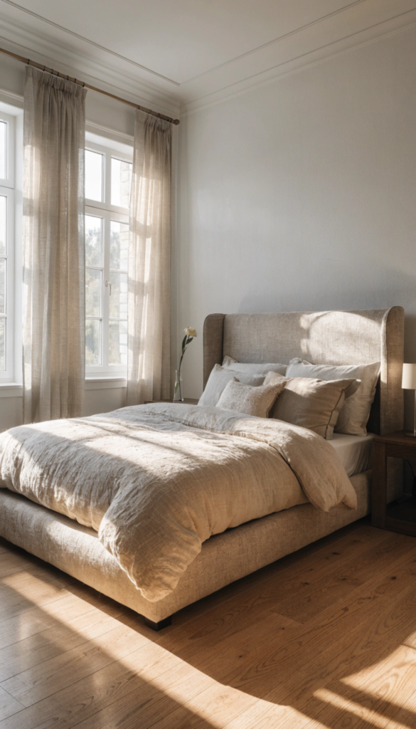 Linen, velvet, bouclรฉ, chunky knit, and smooth cotton all read as elevated materials. You do not need all of them, but mixing two or three within a coherent color palette creates the layered richness that distinguishes a designed room from one that simply has furniture in it. A thick wool or jute rug beside the bed is one of the most affordable luxury upgrades possible. Stepping onto something substantial and warm every morning quietly changes the quality of how you start your day.