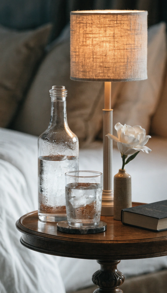 - Place a glass carafe and tumbler on each bedside table for overnight water.